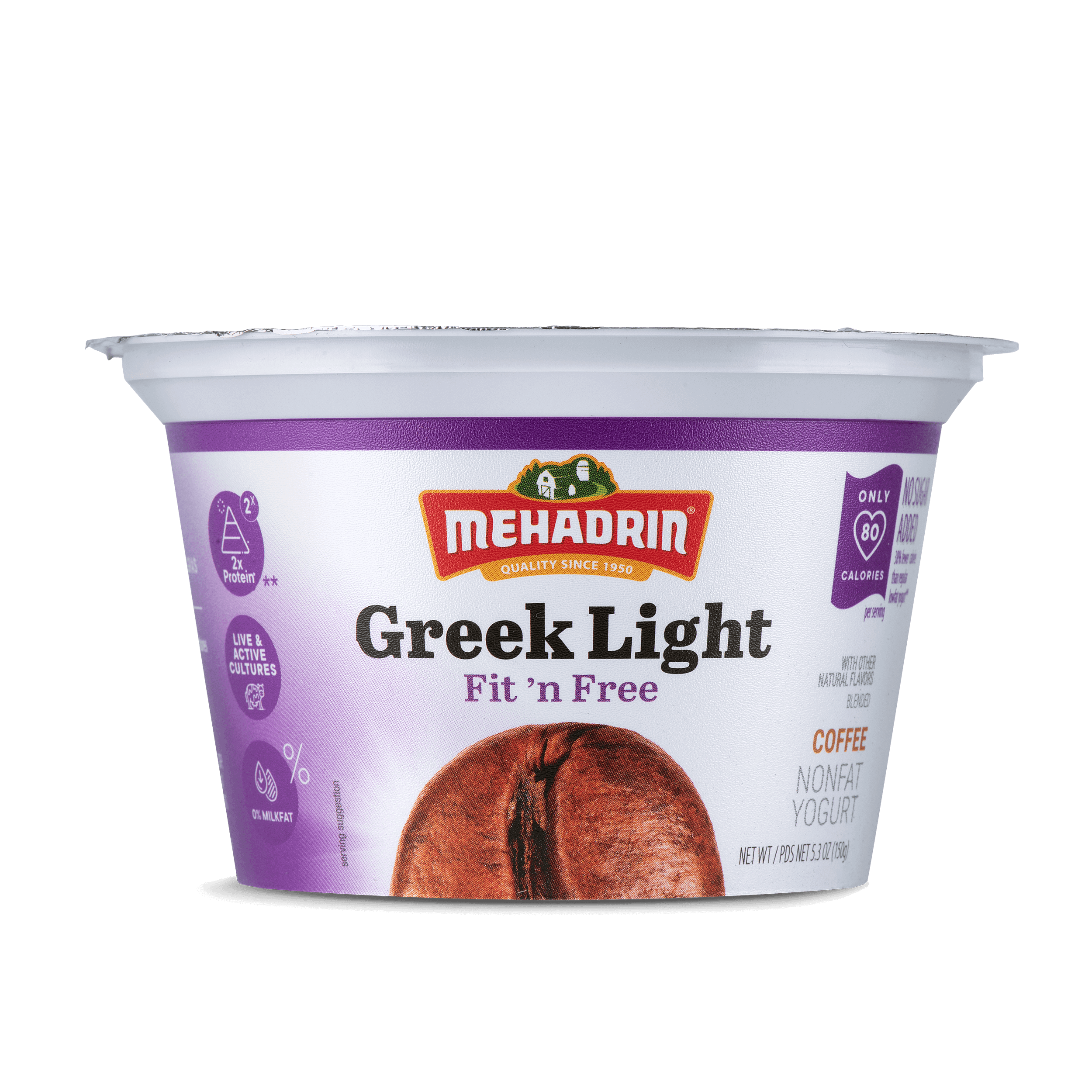 A coffee flavored light greek yogurt made with lowfat milk and real flavors. Utterly smooth and snackable, it contains 0% fat, 2x protien and a ton of probiotics, 13 g of protein, and 130 mg of calcium.